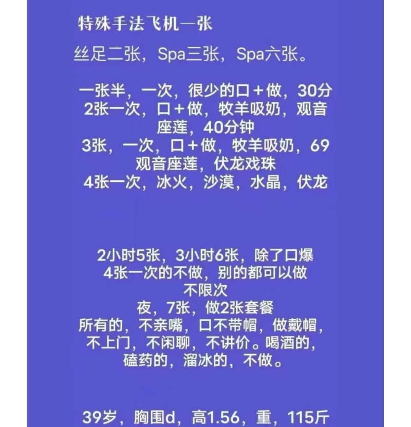 所有的,不亲嘴,口不带帽,做戴帽,不上门,不闲聊,不讲价。喝酒的,磕药的,溜冰的,不做。