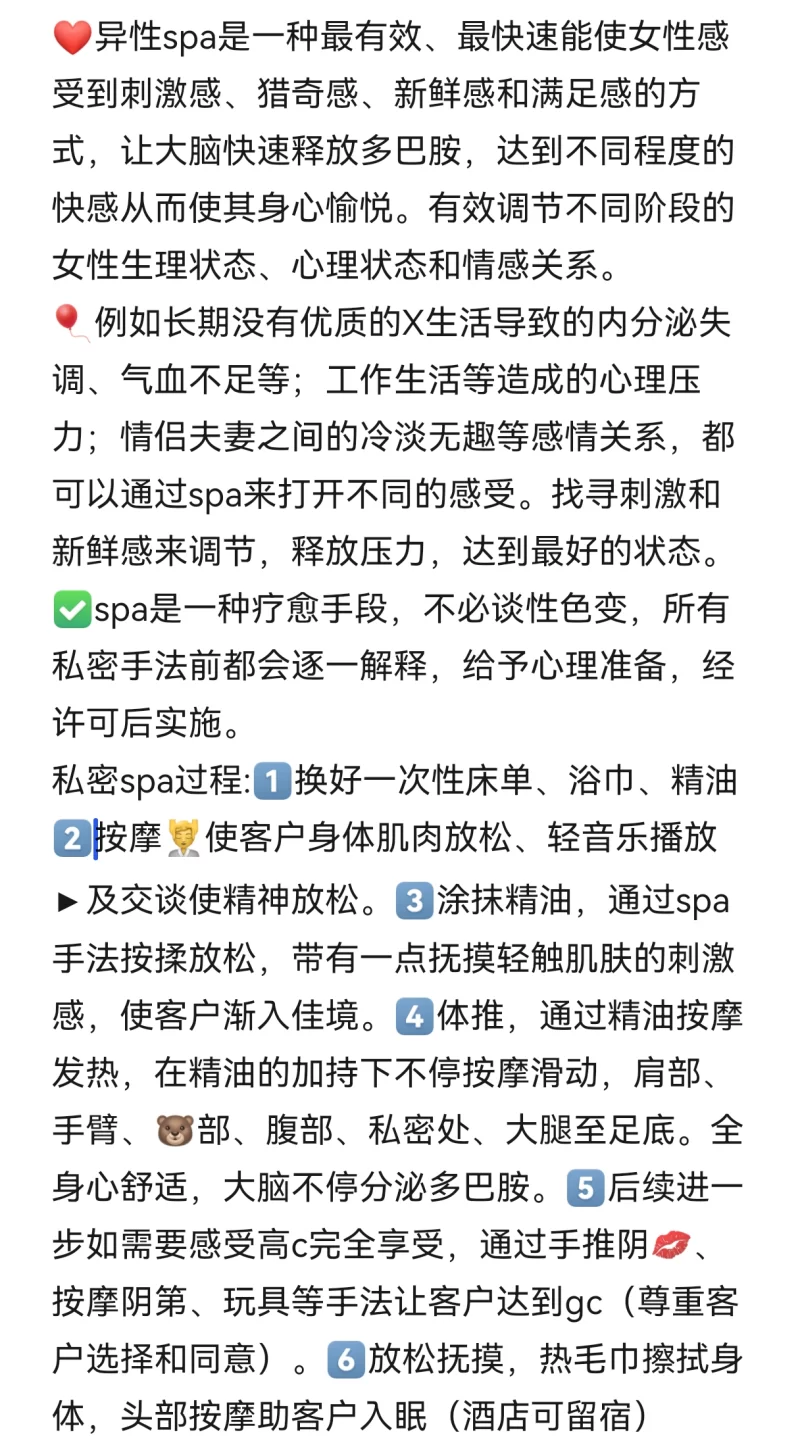 服务项目: 异性私密spa,主打精油开背,肩颈调理,腿部推油,胸部按摩,手臂按摩,肠胃理疗,私密护理spa油压舒缓,情趣漫游,臀部减压推油,子宫卵巢保养,私密护理。